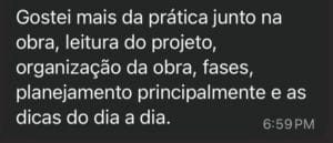 “É muito bom, é simples e objetivo, né, Gustavo…eu vejo ali que você tem a preocupação do bom planejamento para que a gente consiga atender o nosso cronograma e custo. A nossa briga da construção civil é garantir uma boa qualidade e não ultrapassar os custos, e você deixa isso muito bem claro. Você usa técnicas e estratégicas para economizar sem comprometer qualidade. E uma coisa que é muito importante e alguns toques que você dá lá para que evite o retrabalho e problema futuro com manifestação patológica. Cara, e é um curso que a pessoa não precisa ser da área…mas aquele cara que vai começar a construir, que não consegue pagar uma consultoria, até para poder cobrar também o cara que ele vai contratar para fazer a obra dele…porque, pô, tem muita dica por lá, cara. Meus parabéns, viu? Muito bom, tá me ajudando bastante. Obrigado.”