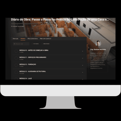 A plataforma se divide em módulos e reúne ensinamentos e vivências de aplicação separados por etapas da obra (do planejamento à entrega), idealizadas e orientadas por mim — Engenheiro Civil especialista em gestão de obras residenciais de médio e alto padrão.